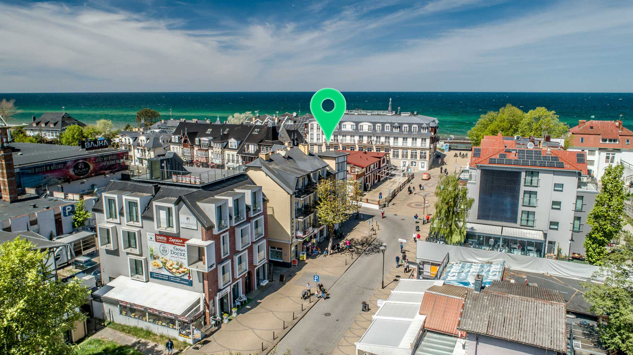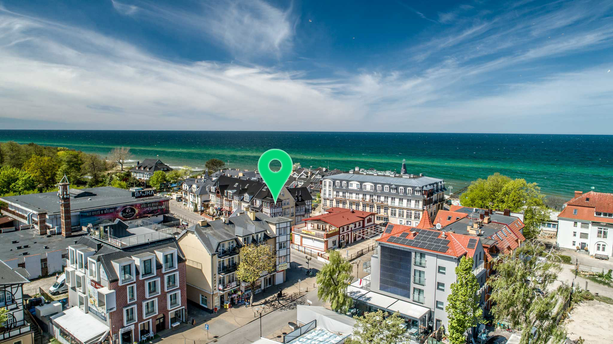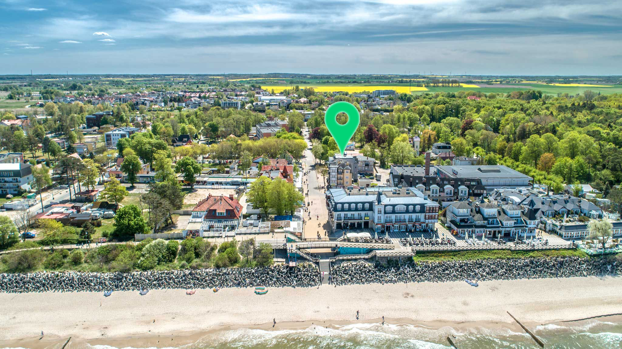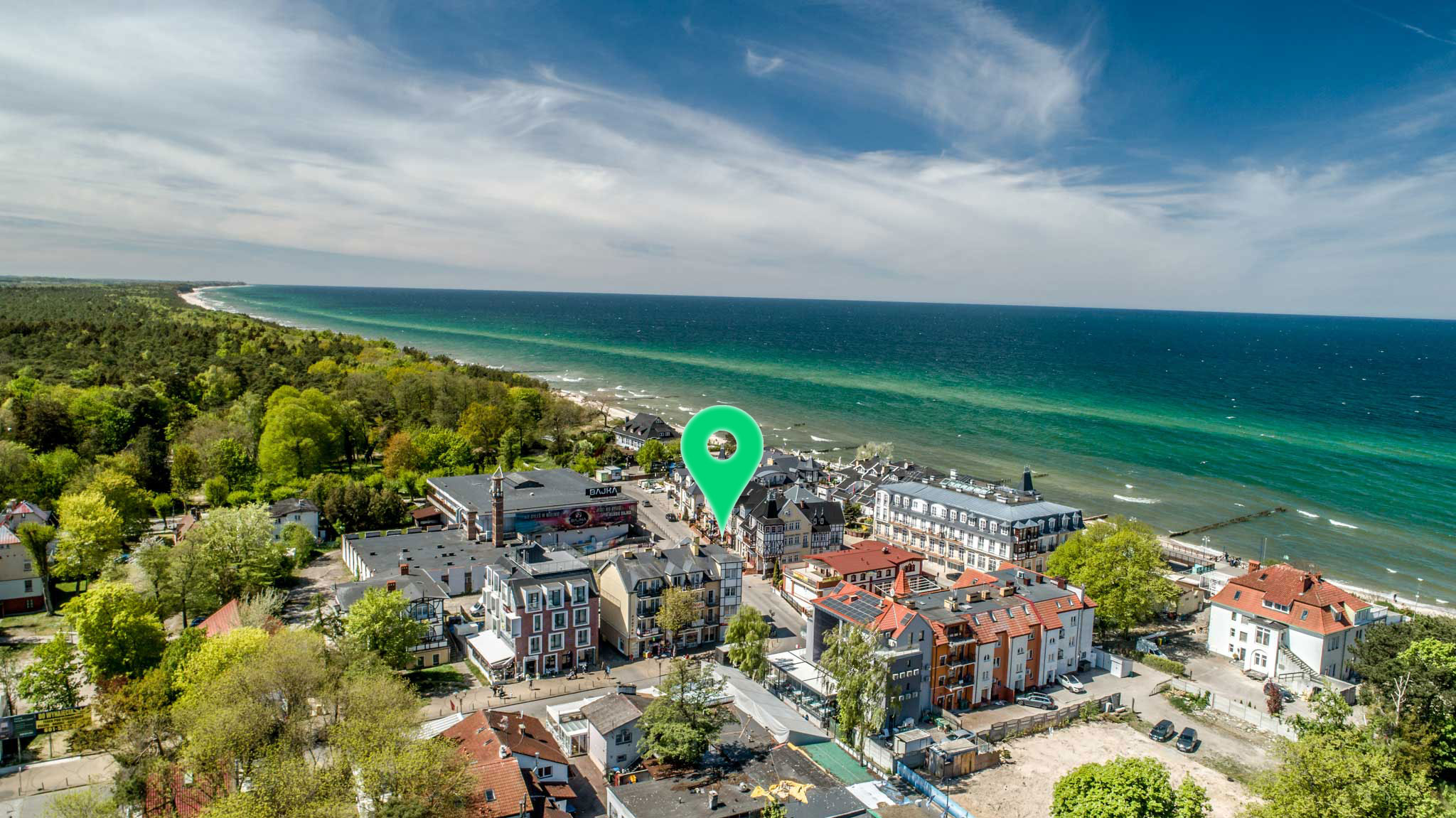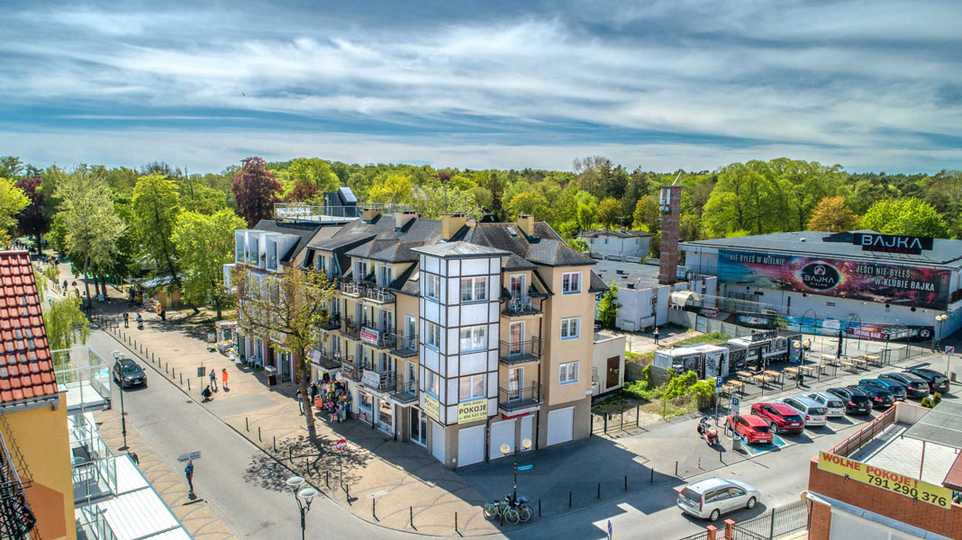 Obiekt położony jest przy samej plaży , z balkonów rozciąga się przepiękny widok na falujący Bałtyk. W odległości kilkudziesięciu metrów znajduje się komleks leśny z wieloma alejkami spacerowymi oraz ścieszkami rowerowymi. Znakomite miejsce do ćwiczeń jogii i medytacji.